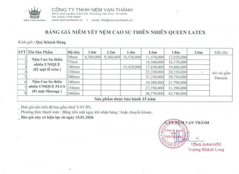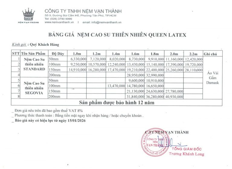 Cập nhật bảng giá nệm cao su Vạn Thành mới nhất 2026 theo từng kích thước, độ dày. Thông tin chính xác, dễ so sánh, tư vấn chọn mua phù hợp. Xem ngay tại bài viết dưới đây