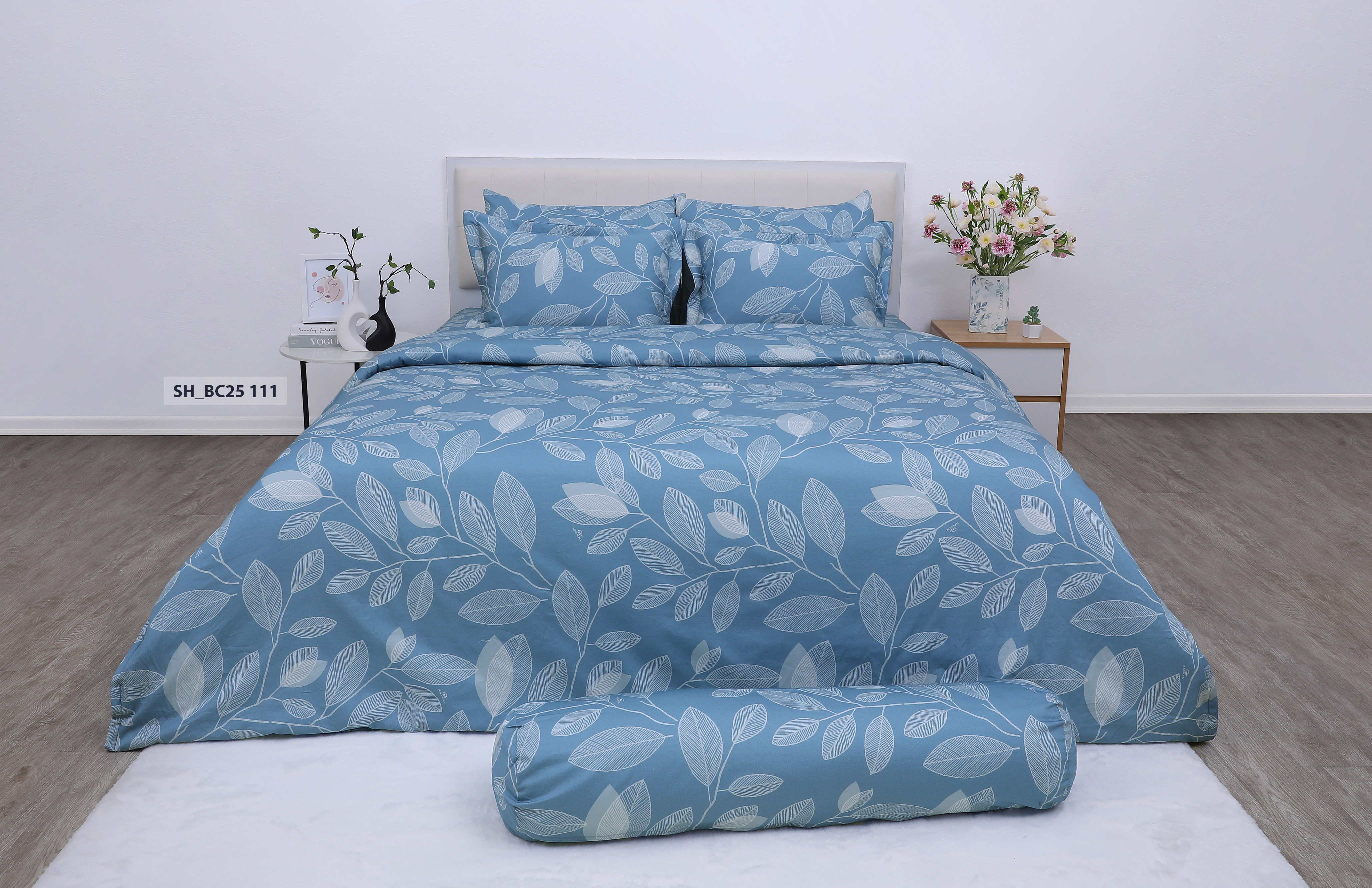 Bộ chăn ga gối BC25111 gây ấn tượng với phong cách thiết kế tối giản mà thanh lịch. Tông xanh lam nhẹ nhàng kết hợp cùng họa tiết lá trắng cách điệu, mang đến tổng thể hài hòa cho không gian nghỉ ngơi. Họa tiết được sắp xếp tinh tế, mềm mại nhưng không rườm rà, phù hợp với nhiều phong cách nội thất hiện đại. Thiết kế này không chỉ giúp phòng ngủ trở nên thoáng đãng, tươi mới mà còn tạo cảm giác thư thái, nhẹ nhàng sau một ngày dài.