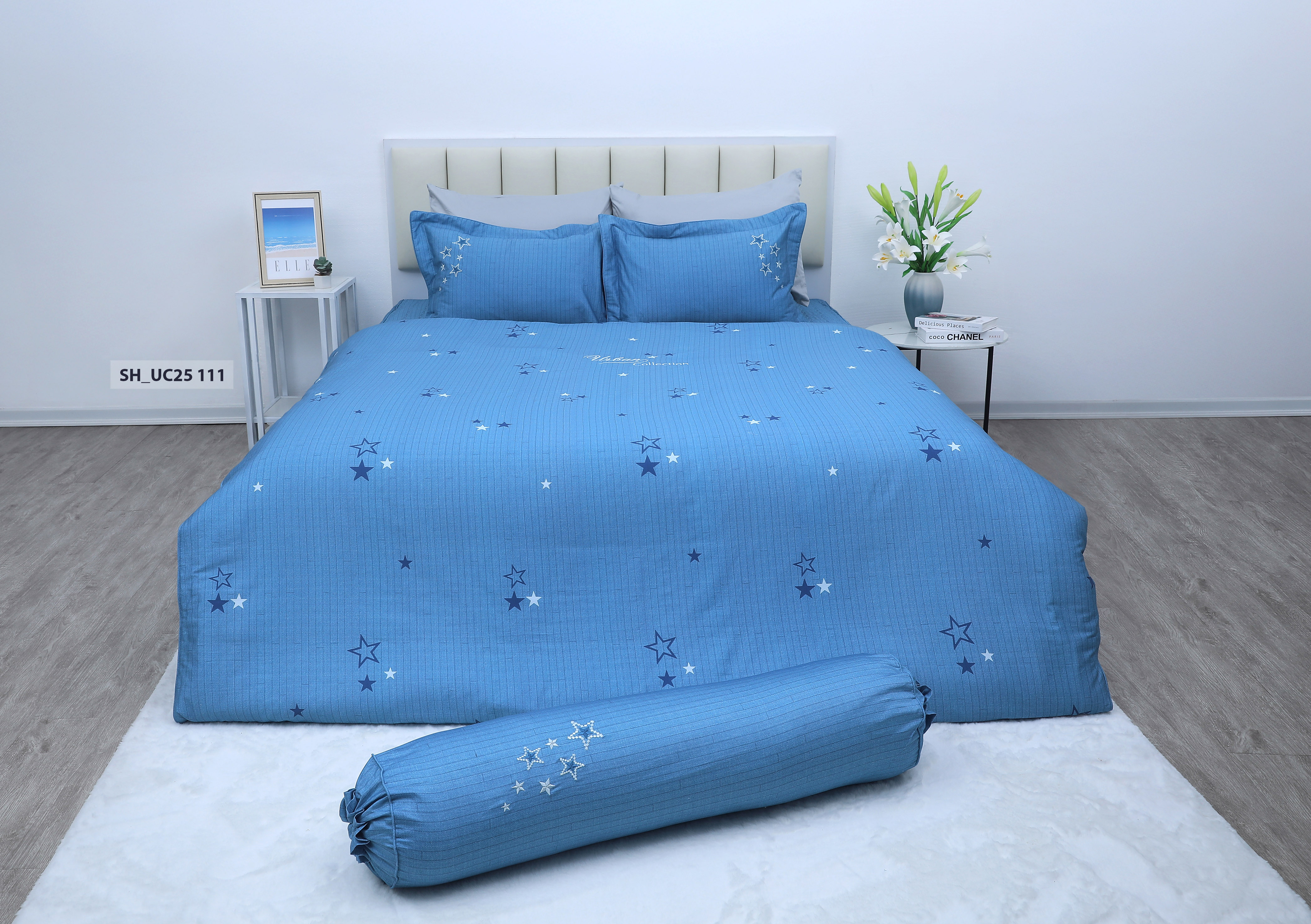 BC25117 nổi bật với sắc xanh denim mát dịu – gam màu gợi sự thư giãn, bình yên cho không gian nghỉ ngơi. Trên nền vải ấy điểm xuyết thêm các họa tiết hình khối độc đáo, tạo nên một thiết kế tối giản mà không đơn điệu. Tổng thế sản phẩm toát lên vẻ hiện đại, tinh tế và có chiều sâu – phù hợp với những ai yêu thích sự gọn gàng, thanh lịch và nhẹ nhàng trong từng chi tiết.