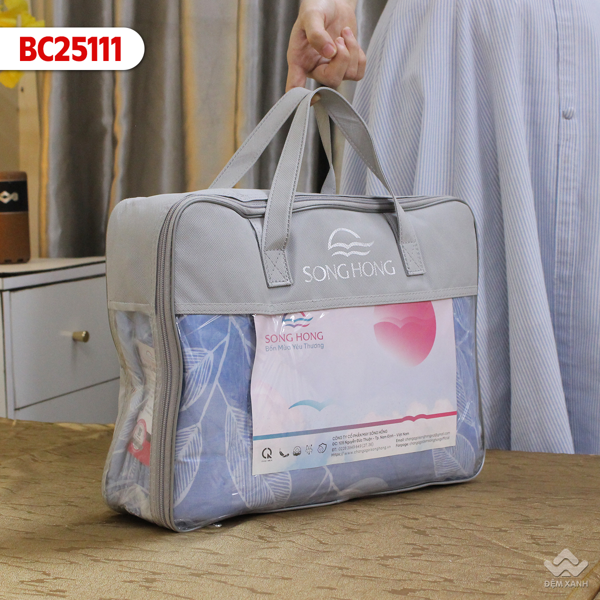 Bộ chăn ga gối BC25111 gây ấn tượng với phong cách thiết kế tối giản mà thanh lịch. Tông xanh lam nhẹ nhàng kết hợp cùng họa tiết lá trắng cách điệu, mang đến tổng thể hài hòa cho không gian nghỉ ngơi. Họa tiết được sắp xếp tinh tế, mềm mại nhưng không rườm rà, phù hợp với nhiều phong cách nội thất hiện đại. Thiết kế này không chỉ giúp phòng ngủ trở nên thoáng đãng, tươi mới mà còn tạo cảm giác thư thái, nhẹ nhàng sau một ngày dài.