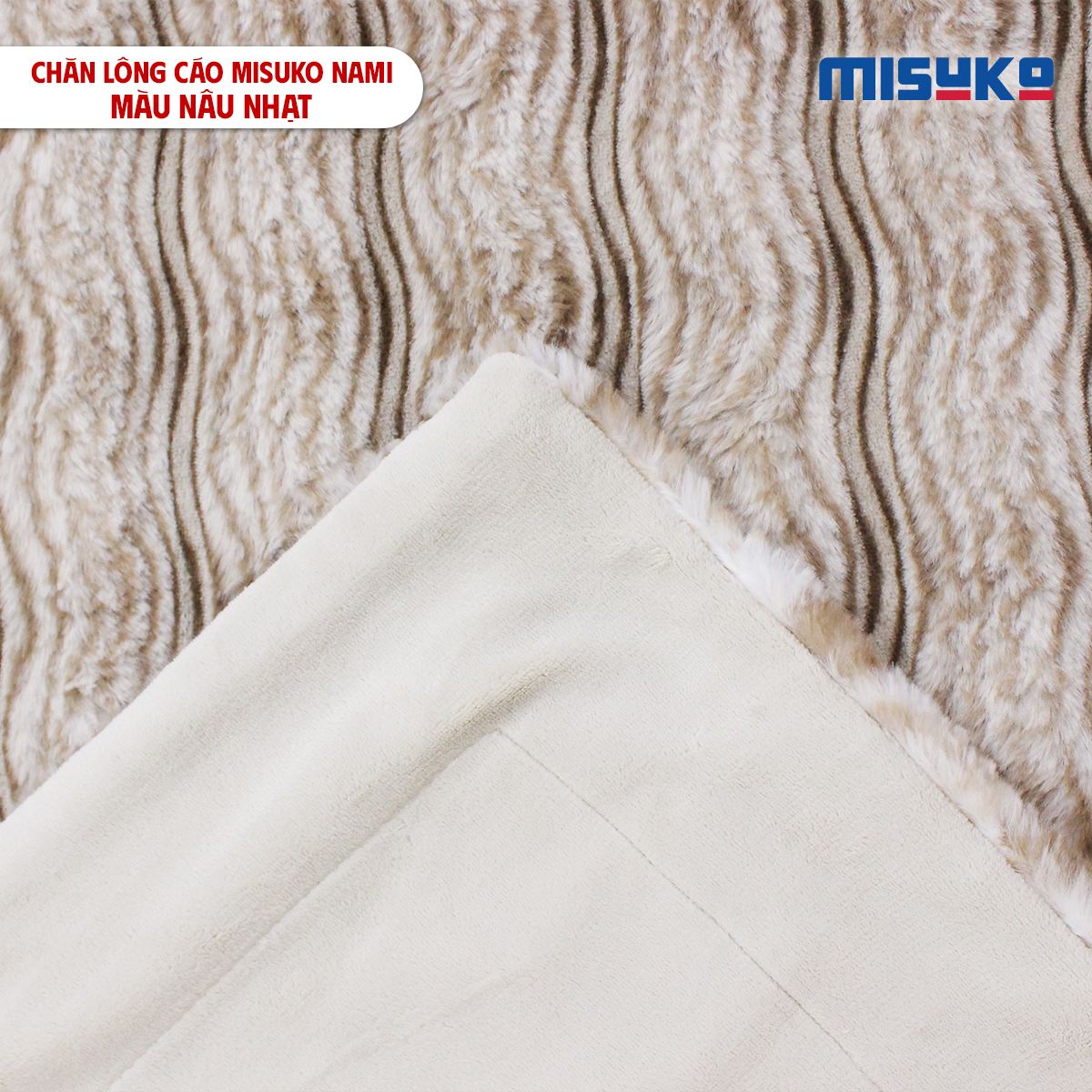 Misuko Nami được làm từ từ lông cáo nhân tạo thế hệ mới cao cấp với các sợi lông dài, mềm mịn và đàn hồi cao. Nhờ đó, bề mặt chăn mịn màng, tạo cảm giác mềm mượt ngay khi chạm vào, không bị thô cứng hay ráp da. Chất liệu thân thiện, an toàn cho làn da nhạy cảm, phù hợp cho cả người lớn tuổi và trẻ nhỏ.