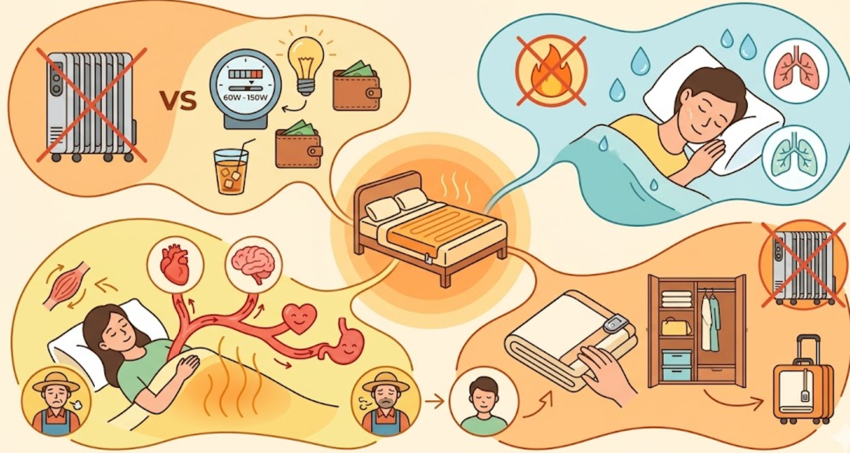 Bài toán kinh tế: Tiết kiệm 90% chi phí: Nếu điều hòa hai chiều hay máy sưởi ngốn của bạn vài triệu tiền điện mỗi tháng, thì đệm điện chỉ tiêu thụ khoảng 60W - 150W. Dùng rả rích cả đêm, tiền điện chỉ tương đương một ly cà phê vỉa hè.