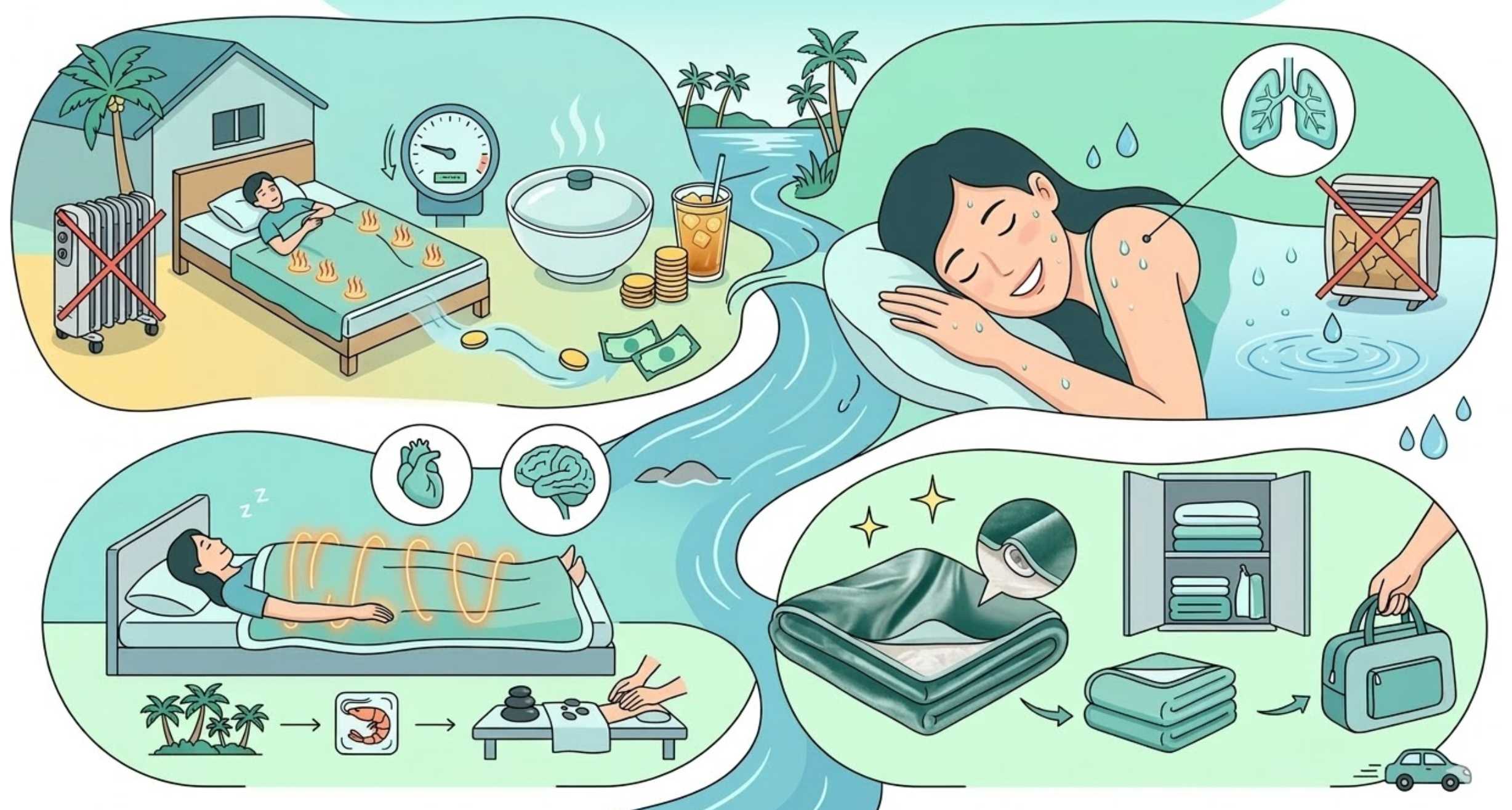 Xua tan độ ẩm vùng duyên hải: Hơi nước biển và độ ẩm cao khiến chăn ga gối nệm luôn có cảm giác bết rít. Chăn đệm điện với cơ chế nhiệt nhẹ nhàng giúp sấy khô bề mặt giường, mang lại sự khô ráo, thơm tho.