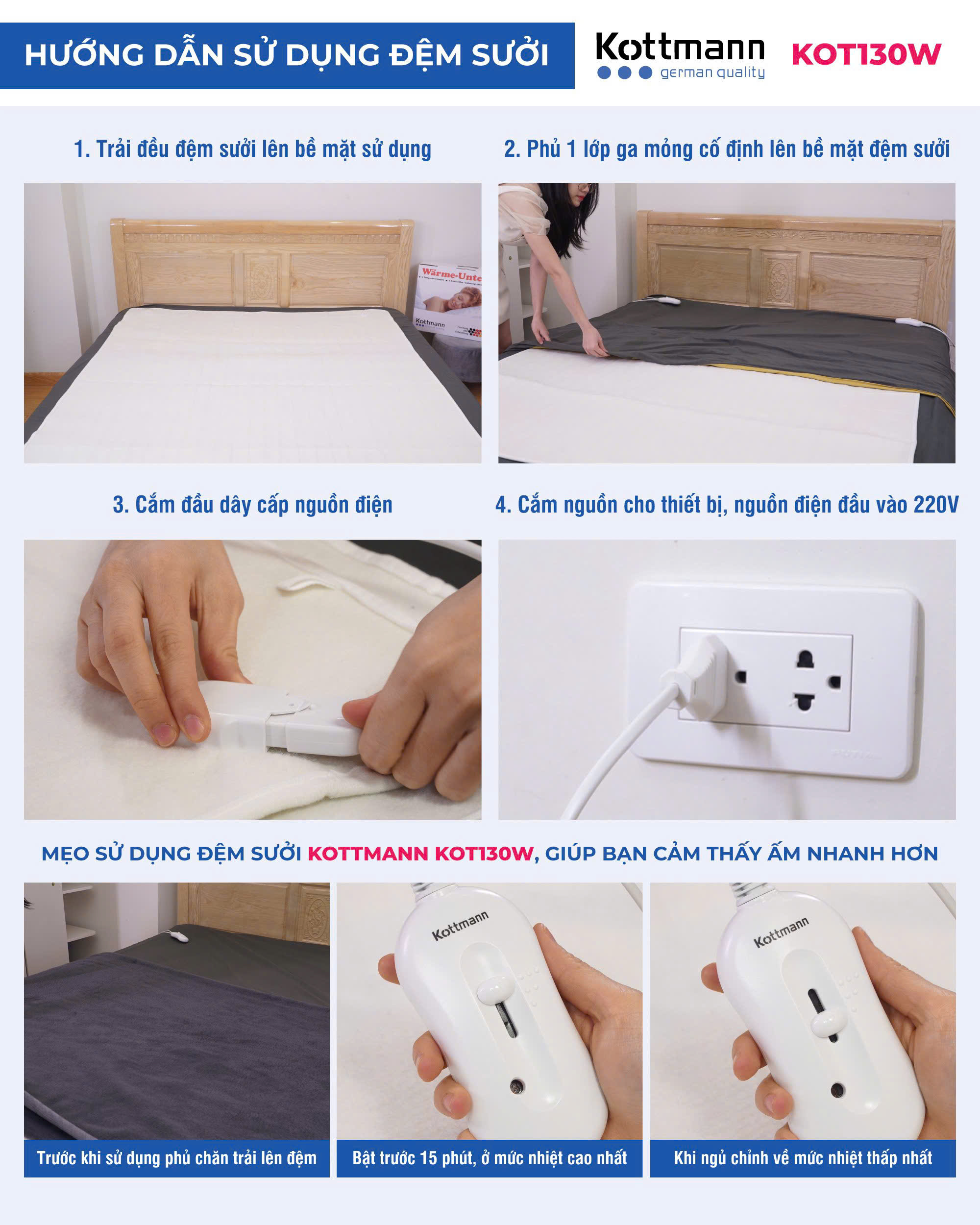 Đệm điện Kottmann có độ an toàn tuyệt đối, nguồn điện 220V qua cục đổi nguồn còn khoảng 15V nên không sợ giật nếu có bị dò điện. Sản phẩm đốt nóng bằng các sợi thủy tinh cứ không phải sợi đồng nên rất an toàn cho người sử dụng. Đệm điện có thể giặt được khoảng 10 lần trong chu kỳ sử dụng của nó, tốt nhất khi sử dụng nên trải 1 lớp ga mỏng lên trên đệm điện thì không phải làm vệ sinh giặt giũ thường xuyên sẽ bền và có tuổi thọ cao hơn rất nhiều.