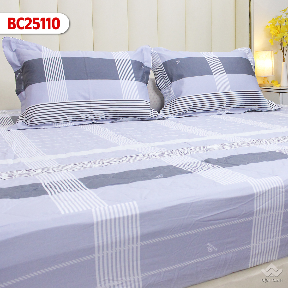 BC25110 gây ấn tượng với họa tiết caro kẻ sọc cổ điển được làm mới trong diện mạo đầy hiện đại và cá tính. Sự hòa quyện giữa các tông xám thanh lịch, xanh than mạnh mẽ và vàng nhạt nhẹ nhàng mang lại tổng thể cân bằng, tạo cảm giác vừa trang nhã vừa tràn đầy năng lượng. Những đường kẻ ngang – dọc được bố trí khoa học, giúp không gian phòng ngủ trở nên ngăn nắp, có chiều sâu và đậm chất tối giản. Thiết kế này không chỉ là điểm nhấn thẩm mỹ, mà còn có tính ứng dụng cao khi dễ dàng phối hợp với nhiều kiểu nội thất